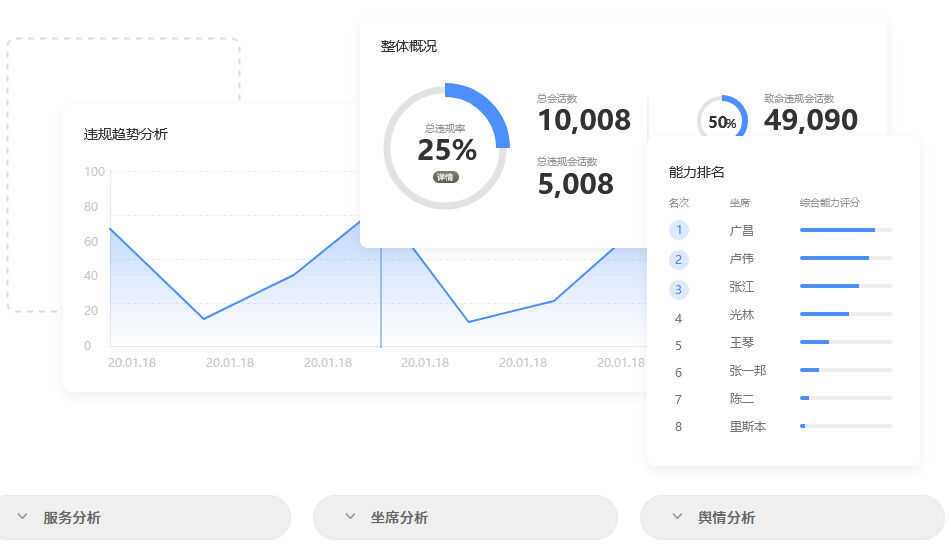 通过“通用规则+业务规则+流程规则+人工规则”四种规则模式,针对多部门、多业务类型的情况,支持配置多套评分模板和打分模式。全量质检业务语音、文本对话以及服务流程,T+1天输出质检报告。