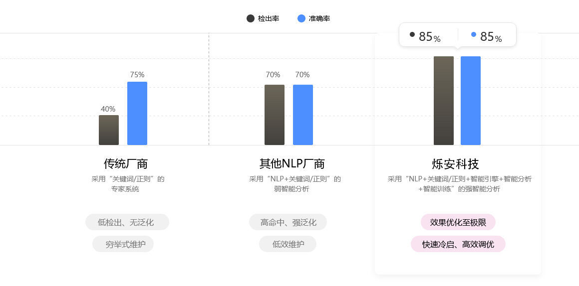 企业的服务对话数据中隐含大量的客户意见、营销机会、业务舆情,智能分析机器人同时具备语义和语音的多维分析引擎,充分挖掘这些有价值但容易沉没的企业数据。相比传统的专家系统和大部分NLP厂商,以“深度神经网络”为基石的语义标签算子,配合语速、静音、抢话、敏感词等多维算子,保障数据分析结果的准确率和有效性,帮助企业抓住业务增长、服务提升、风险管控的机会。